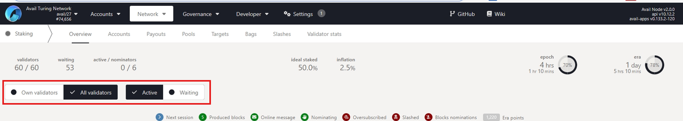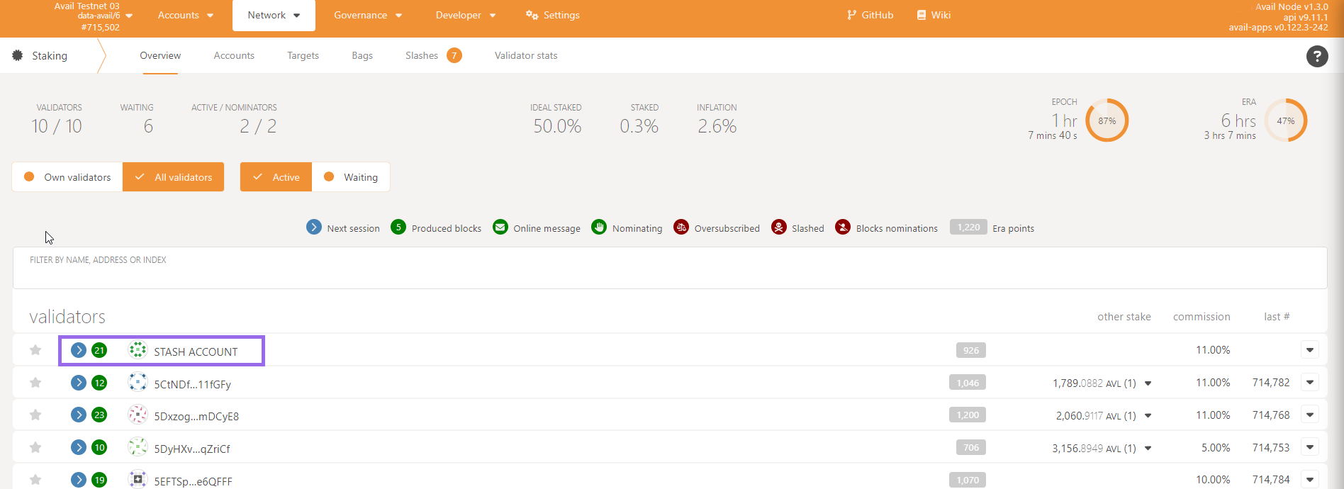 Your validator is now prepared to begin the validation process. If you wish to discontinue, you can click the stop icon. Please note that the Avail interface doesn’t automatically verify if your node is synchronized; you’ll need to confirm this manually. If your node has sufficient stake, the Avail blockchain will likely select it in the next epoch or two.