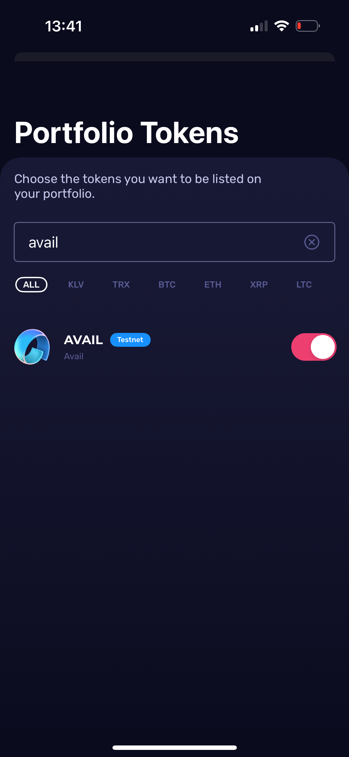 - Search for Avail testnets either by name or by token symbol. Make sure the network is toggled on.