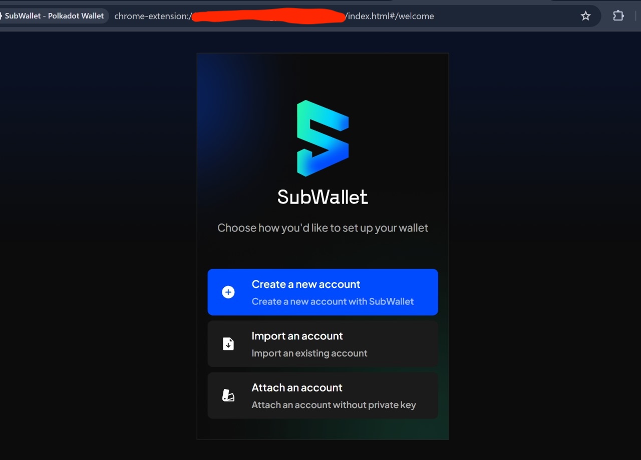 - Go to Subwallet.app and install their browser extension. Once installed, you should se a few different options to get started. We will create an account from scratch, although you can import existing accounts too.