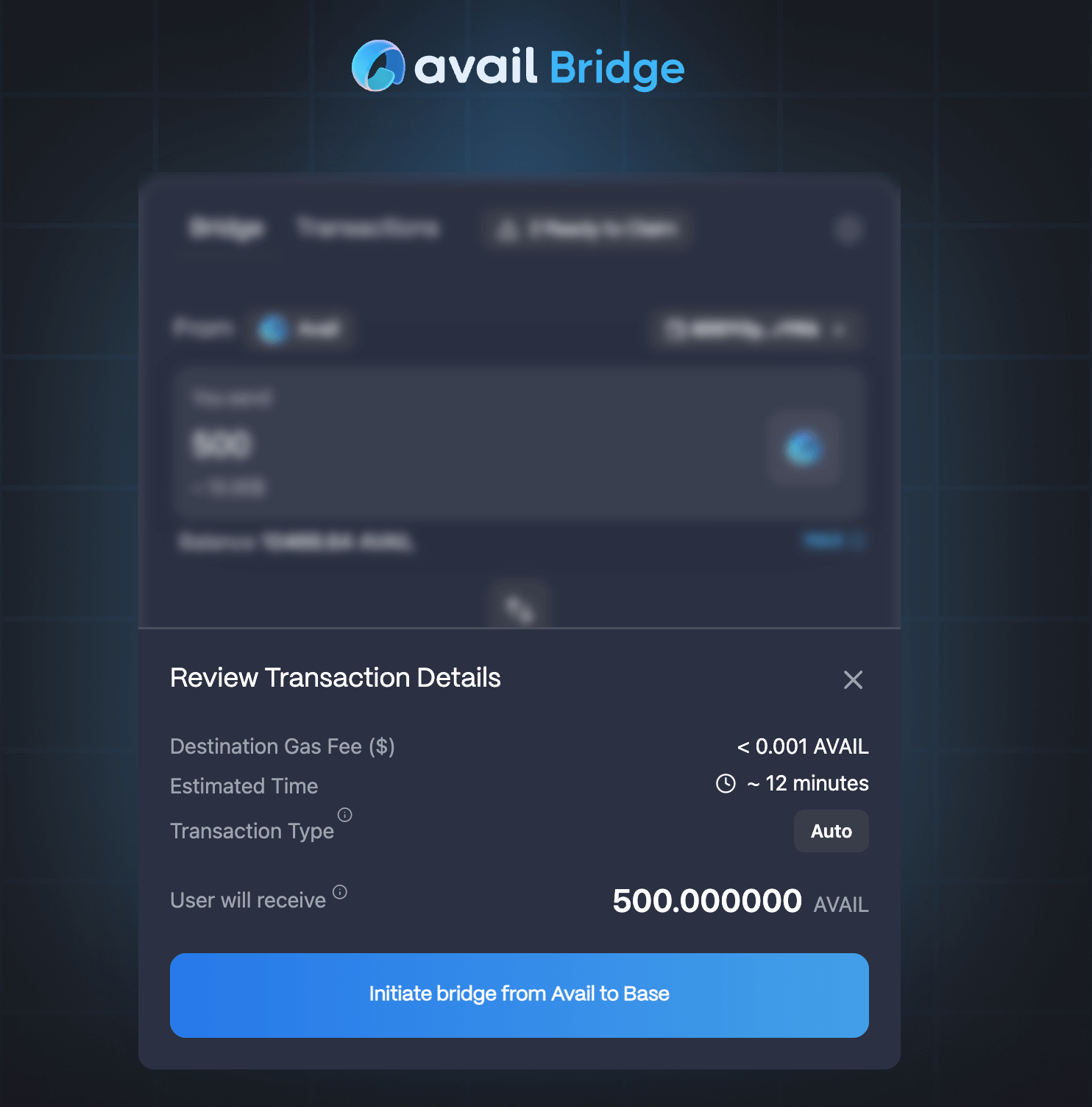 The bridging process between Avail & Base takes around 5 minutes and the funds are sent automatically to the user on the destination chain.