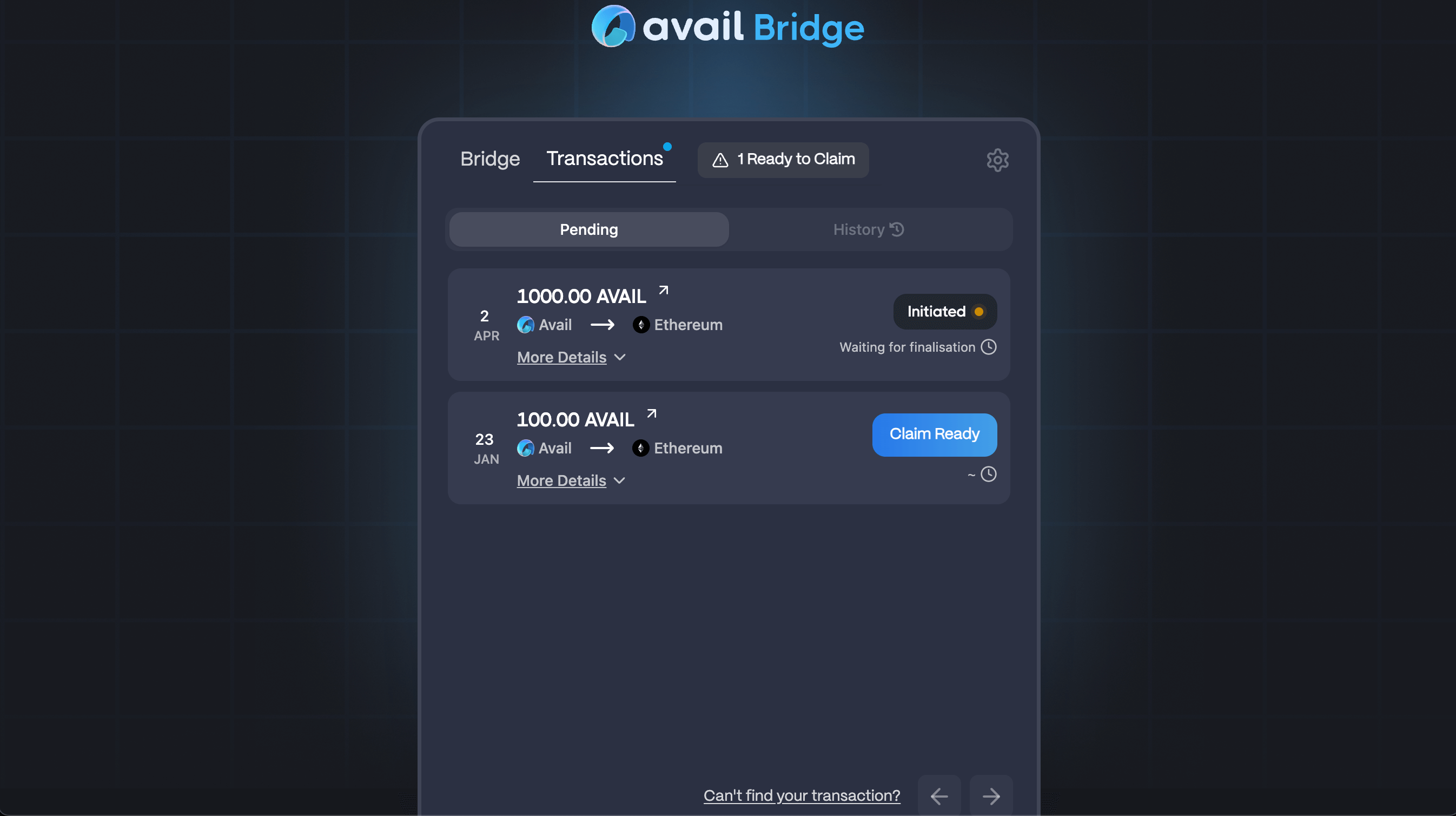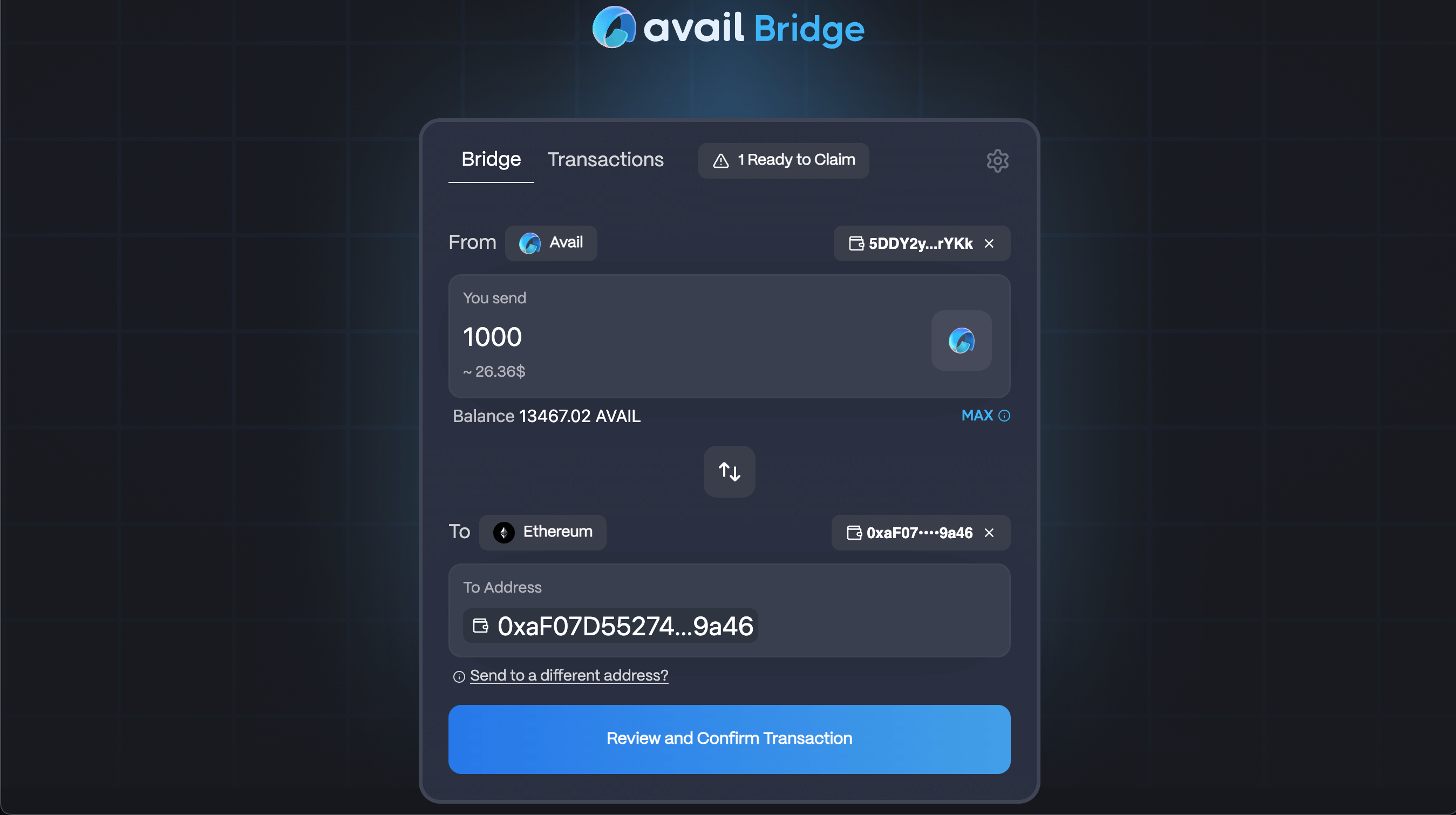 Transactionstab and claim AVAIL by making sure your EVM wallet is connected to Ethereum mainnet, and clicking theClaim Readybutton. Conversely, if you initiate the bridging process from Ethereum and want to claim your AVAIL tokens on Avail DA, make sure your Avail wallet is connected to Avail DA mainnet, and click theClaim Readybutton.