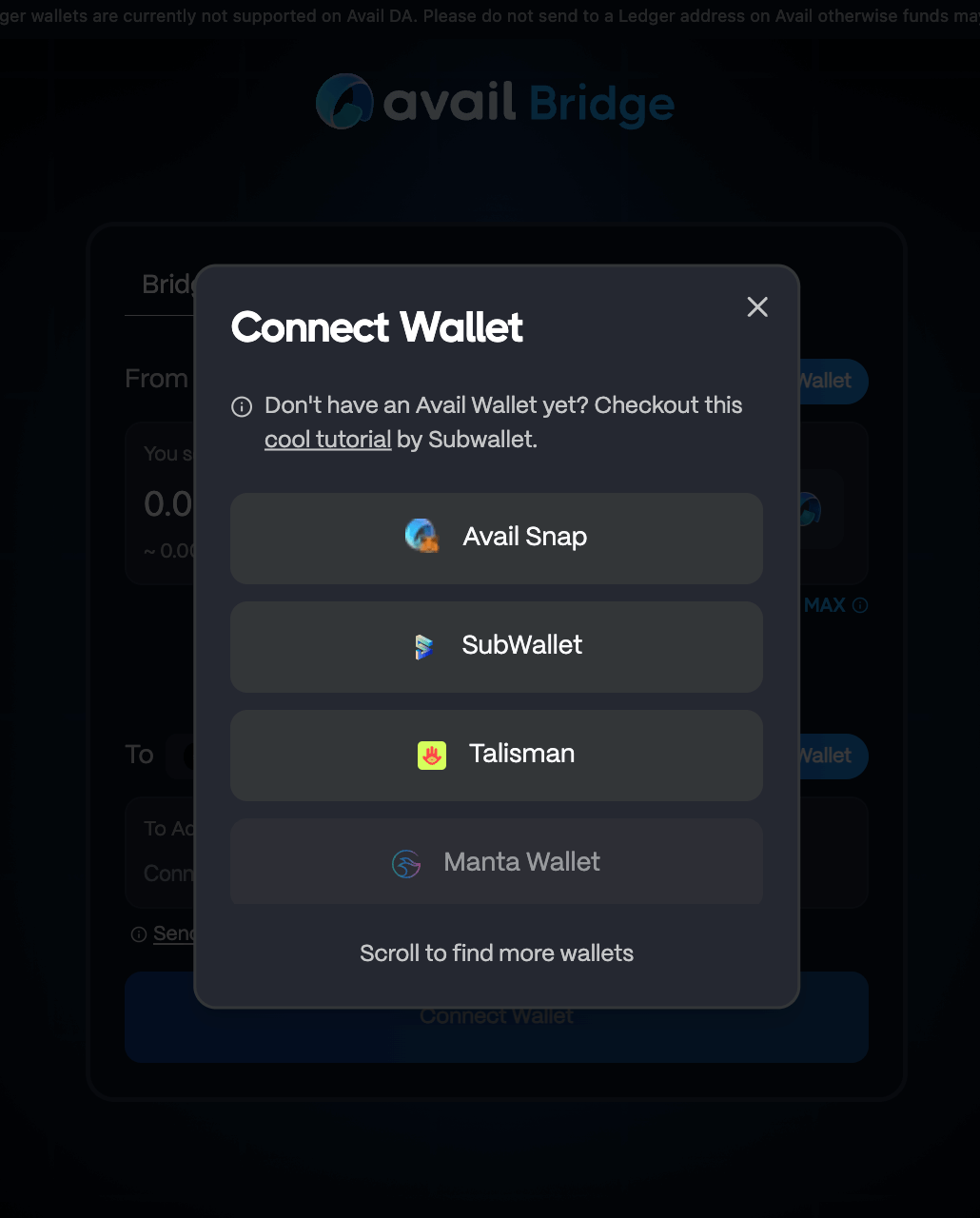 - The Avail bridge UI currently only supports bridging AVAIL tokens between Avail DA and Ethereum.