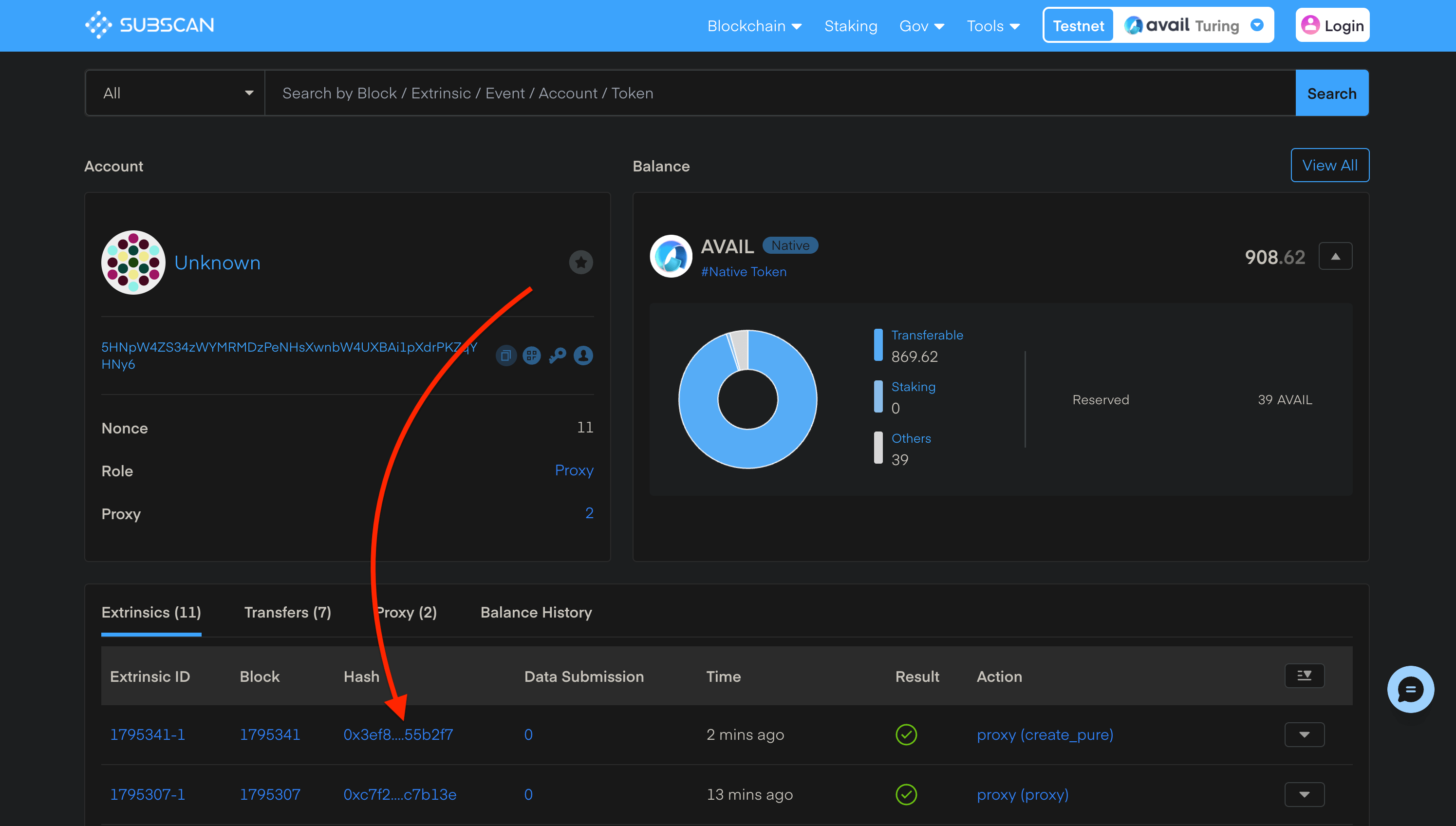 Head on over to the accounts section of the Avail explorer and connect your main account. In my case, I start out with the highlighted account.