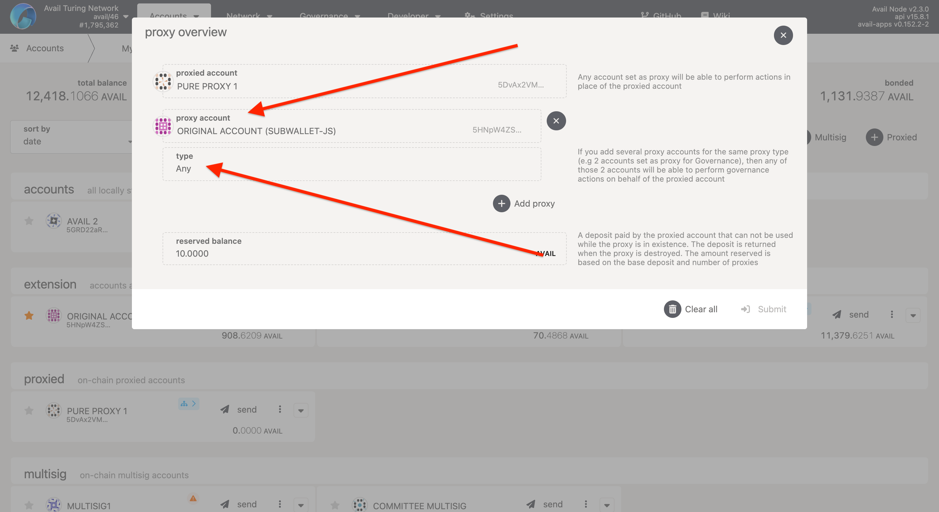 any proxyfor this new account, in my case ‘Pure Proxy 1’. - ‘Pure Proxy 1’ thus acts as a proxied account and we can use it to sign transactions on-chain, even though we don’t have access to it’s private key.
